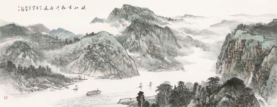 施江城《峽江云飛千舟遠》367×144cm 2025年