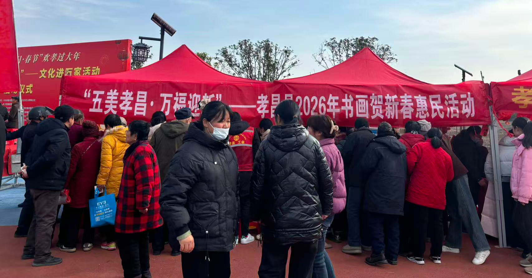 廣場(chǎng)一側(cè),墨韻飄香,“萬(wàn)福下鄉(xiāng)”送春聯(lián)、送年畫(huà)活動(dòng)現(xiàn)場(chǎng)排起長(zhǎng)隊(duì)。來(lái)自孝昌的書(shū)畫(huà)家們揮毫潑墨,將寓意吉祥的春聯(lián)、福字和年畫(huà)送到群眾手中。特色農(nóng)產(chǎn)品集市同樣人氣高漲,孝感麻糖米酒、周巷苗木花卉、孝昌太子米等本地農(nóng)產(chǎn)品攤位前,群眾紛紛駐足選購(gòu),洋溢著濃濃的年味與鄉(xiāng)土情懷。